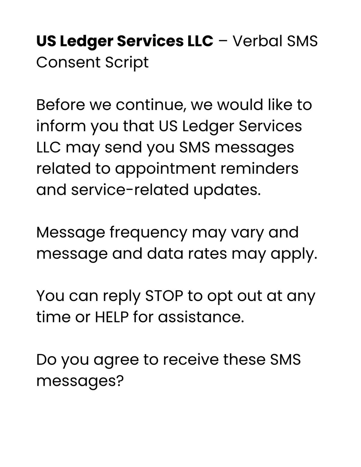 Before we continue, we would like to inform you that US Ledger Services LLC may send you SMS messages related to appointment reminders and service-related updates.